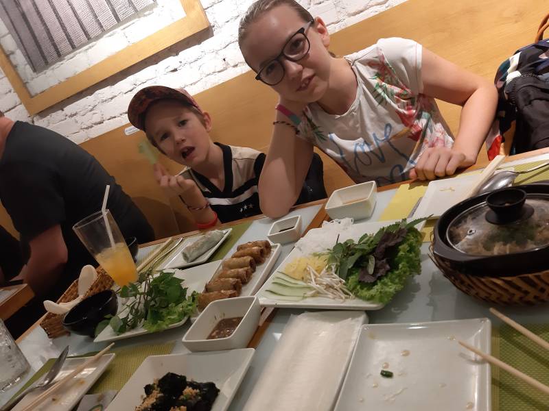 We eten hotpot bij wrapenroll. We hebben er een keer eerder gegeten en vertrouwden het dermate dat we er vlees eten. Hotpot is een Vietnamees gerecht en is een hete bouillon wat je je eten in doet en dan opeet . soort fondue. We wisten alleen niet wat er in moest een waar je gewoon kon eten. De ober heeft het steeds voorgedaan. Ook waren er veel verse ingrediënten om zelf fresh springrolls te maken met rijstpapier.